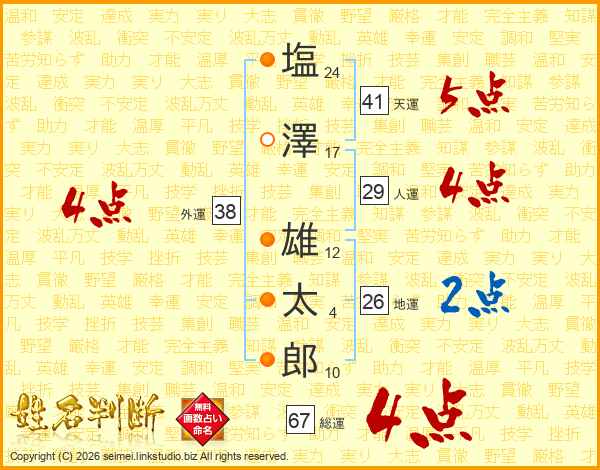 塩(24画)澤(17画) 雄(12画)太(4画)郎(10画)