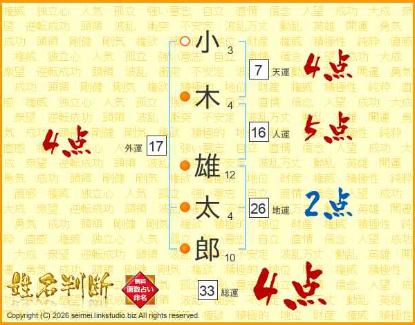 小(3画)木(4画) 雄(12画)太(4画)郎(10画)