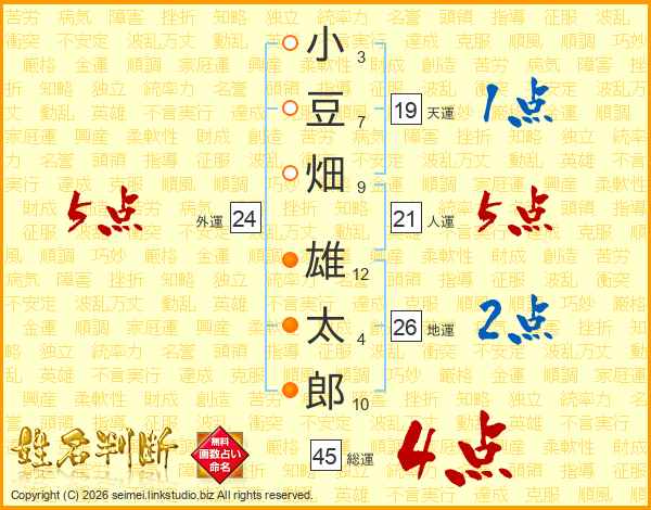 小(3画)豆(7画)畑(9画) 雄(12画)太(4画)郎(10画)