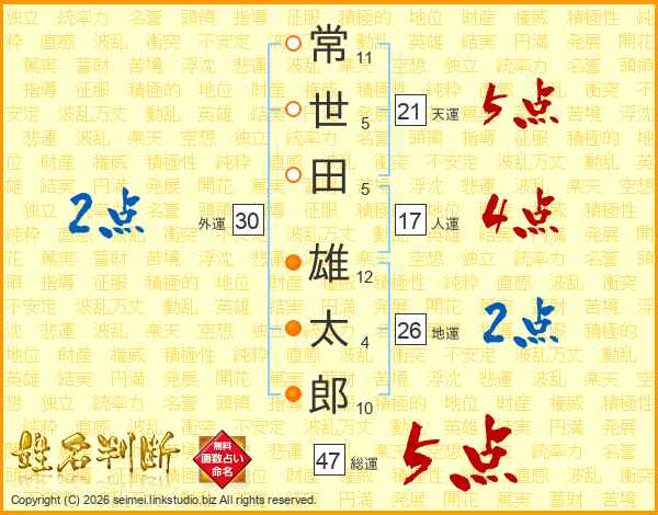 常(11画)世(5画)田(5画) 雄(12画)太(4画)郎(10画)