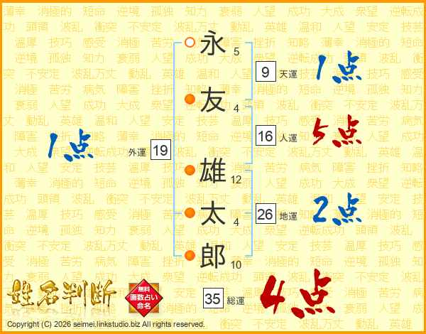 永(5画)友(4画) 雄(12画)太(4画)郎(10画)