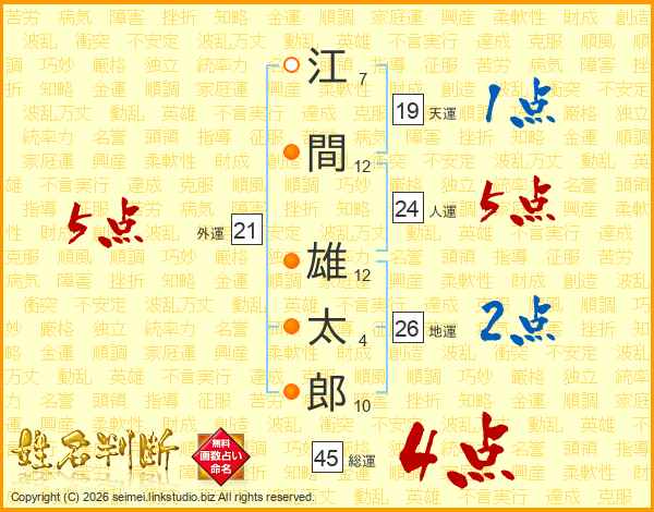 江(7画)間(12画) 雄(12画)太(4画)郎(10画)