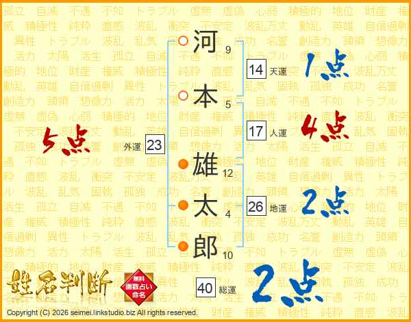 河(9画)本(5画) 雄(12画)太(4画)郎(10画)