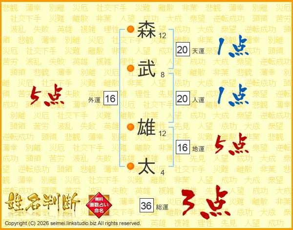 森(12画)武(8画) 雄(12画)太(4画)