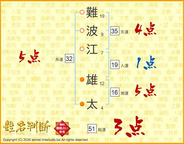 難(19画)波(9画)江(7画) 雄(12画)太(4画)