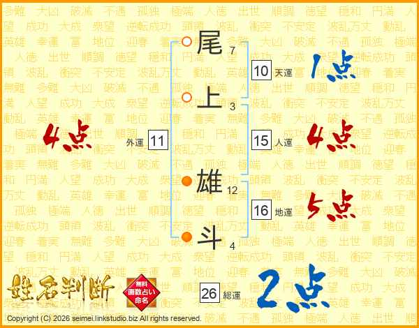 尾(7画)上(3画) 雄(12画)斗(4画)