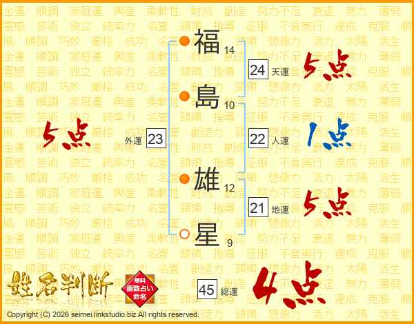 あなたの人生を表す1番重要な運勢です。生涯を通じて影響する総合運となり、主に50歳以降の晩年期に影響を及ぼします。苗字と名前の合計画数。