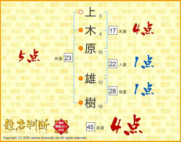 上(3画)木(4画)原(10画) 雄(12画)樹(16画)