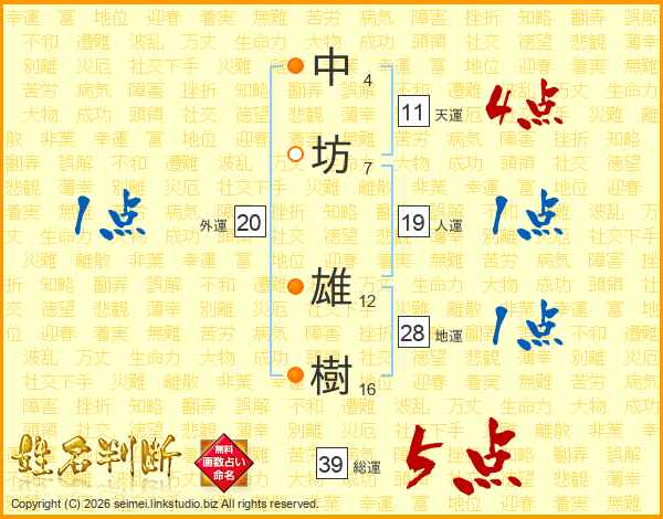 中(4画)坊(7画) 雄(12画)樹(16画)