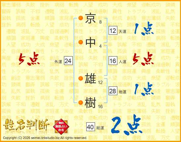 生活面を象徴する運勢です。外部から受ける影響力を表し、結婚運、家庭運や職場、環境への順応性を表します。総運から人運を引いた画数。姓や名が1文字の場合を除く。