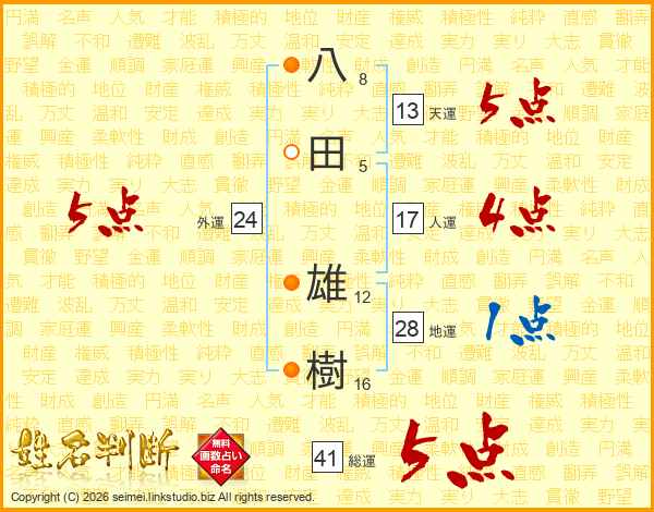 あなたの人生を表す1番重要な運勢です。生涯を通じて影響する総合運となり、主に50歳以降の晩年期に影響を及ぼします。苗字と名前の合計画数。