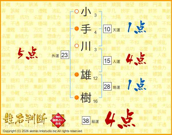 小(3画)手(4画)川(3画) 雄(12画)樹(16画)