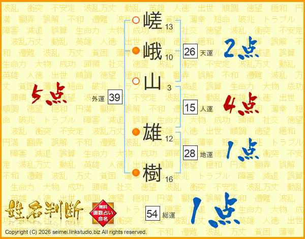 嵯(13画)峨(10画)山(3画) 雄(12画)樹(16画)