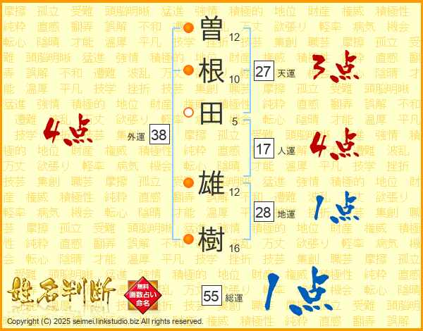 曽(12画)根(10画)田(5画) 雄(12画)樹(16画)