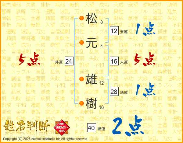 松(8画)元(4画) 雄(12画)樹(16画)