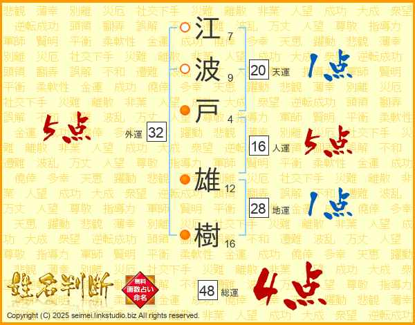 江(7画)波(9画)戸(4画) 雄(12画)樹(16画)