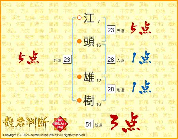 江(7画)頭(16画) 雄(12画)樹(16画)
