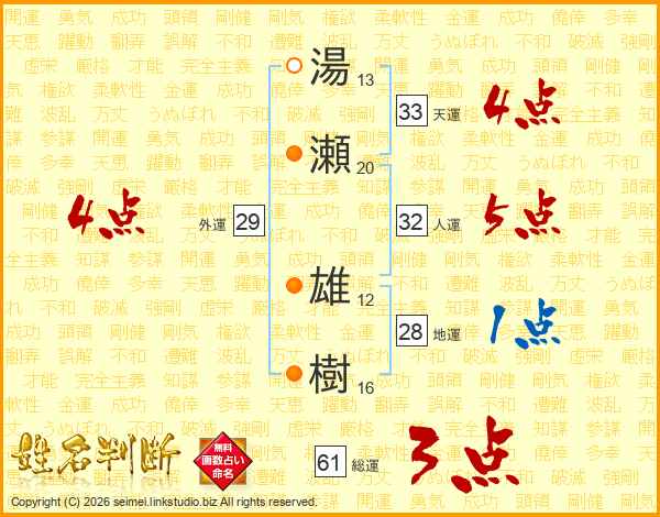湯(13画)瀬(20画) 雄(12画)樹(16画)