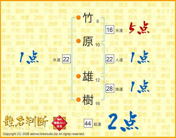 竹原雄樹さんの総運は44画の2点!