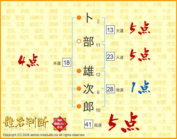 卜(2画)部(11画) 雄(12画)次(6画)郎(10画)