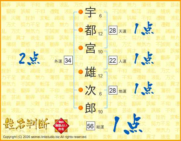 宇都宮雄次郎さんの総運は56画の1点!