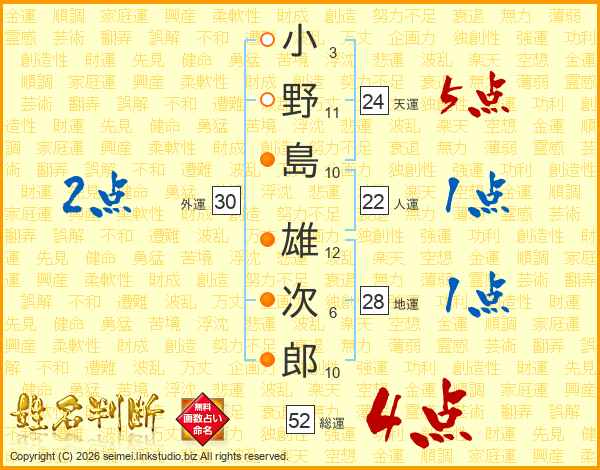 小(3画)野(11画)島(10画) 雄(12画)次(6画)郎(10画)