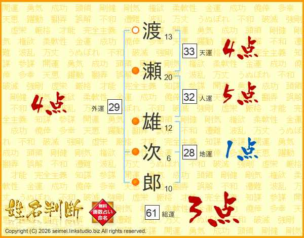 渡瀬雄次郎さんの天運は33画の4点!