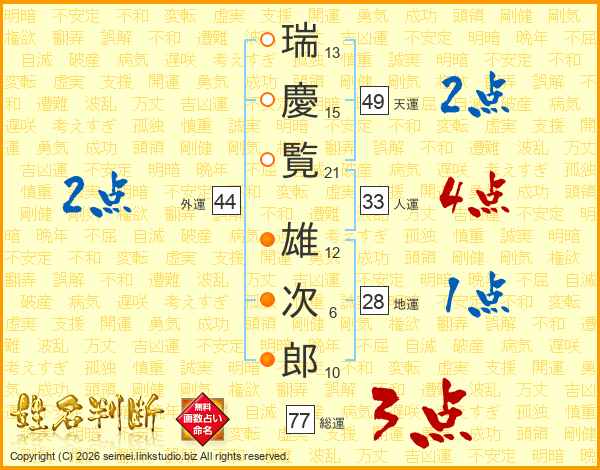 瑞(13画)慶(15画)覧(21画) 雄(12画)次(6画)郎(10画)
