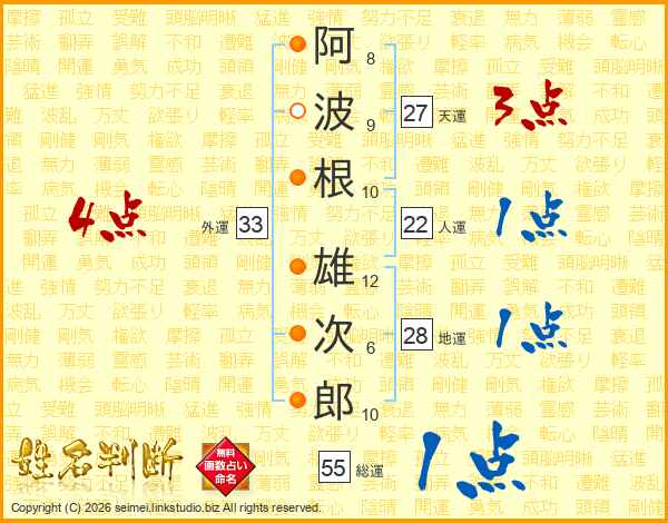 阿(8画)波(9画)根(10画) 雄(12画)次(6画)郎(10画)