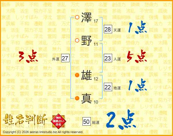 澤(17画)野(11画) 雄(12画)真(10画)
