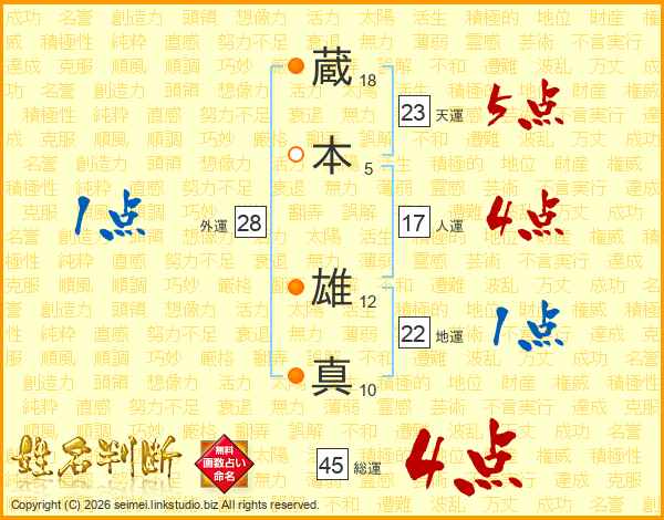 蔵(18画)本(5画) 雄(12画)真(10画)