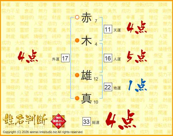 あなたの人生を表す1番重要な運勢です。生涯を通じて影響する総合運となり、主に50歳以降の晩年期に影響を及ぼします。苗字と名前の合計画数。