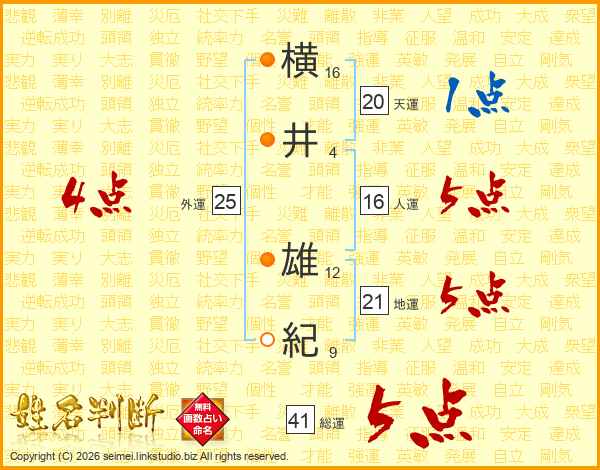 あなたの人生を表す1番重要な運勢です。生涯を通じて影響する総合運となり、主に50歳以降の晩年期に影響を及ぼします。苗字と名前の合計画数。