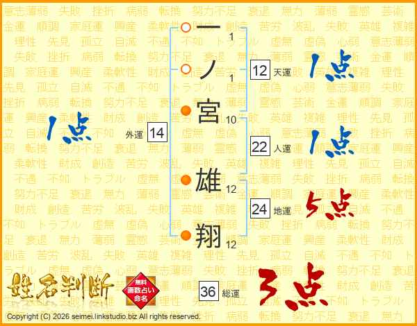 一(1画)ノ(1画)宮(10画) 雄(12画)翔(12画)