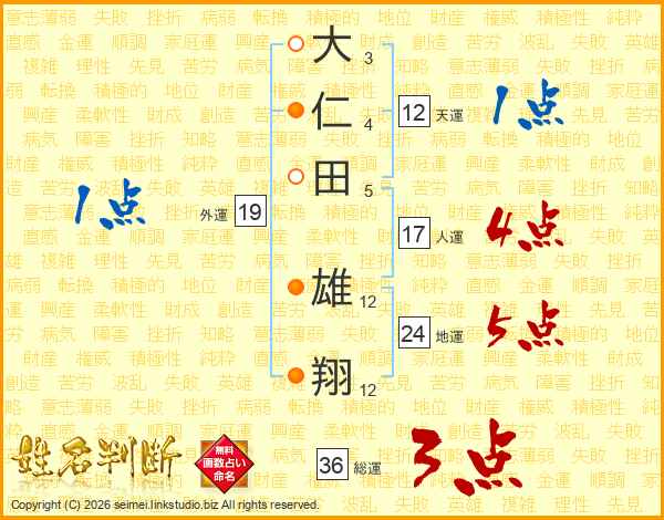 大(3画)仁(4画)田(5画) 雄(12画)翔(12画)