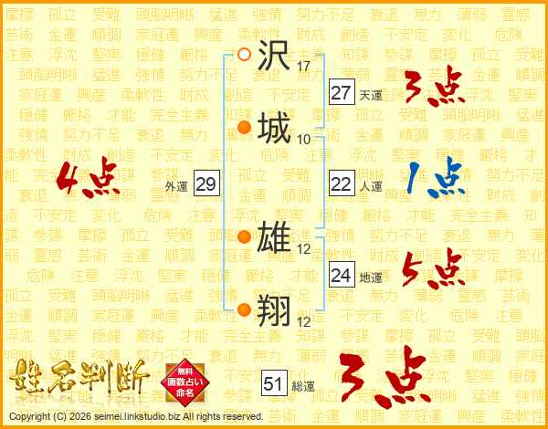 沢(17画)城(10画) 雄(12画)翔(12画)