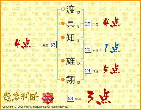 渡(13画)具(8画)知(8画) 雄(12画)翔(12画)