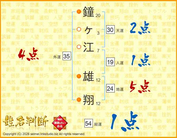 鐘ヶ江雄翔さんの総運は54画の1点!