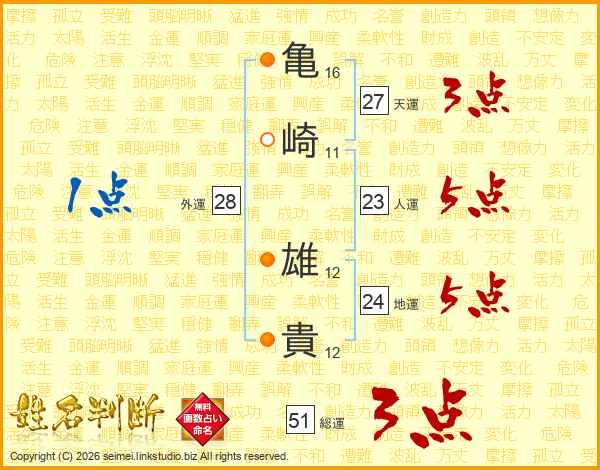 亀(16画)崎(11画) 雄(12画)貴(12画)