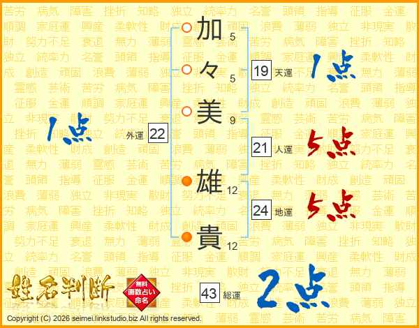 加(5画)々(5画)美(9画) 雄(12画)貴(12画)