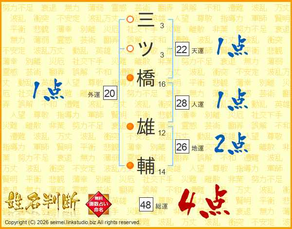 三(3画)ツ(3画)橋(16画) 雄(12画)輔(14画)