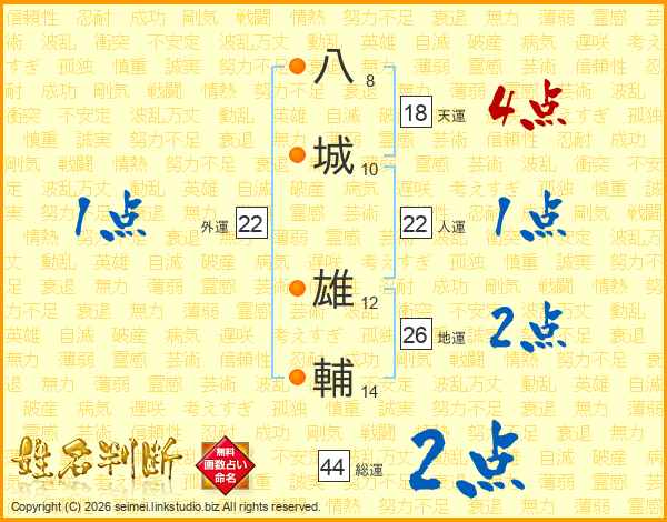 生活面を象徴する運勢です。外部から受ける影響力を表し、結婚運、家庭運や職場、環境への順応性を表します。総運から人運を引いた画数。姓や名が1文字の場合を除く。