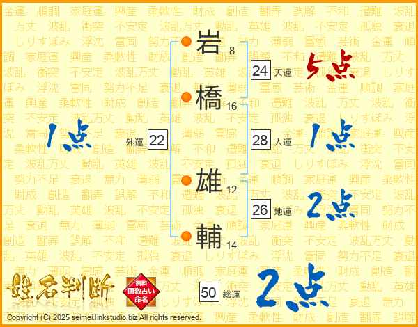 岩(8画)橋(16画) 雄(12画)輔(14画)