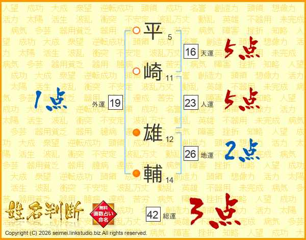 平(5画)崎(11画) 雄(12画)輔(14画)