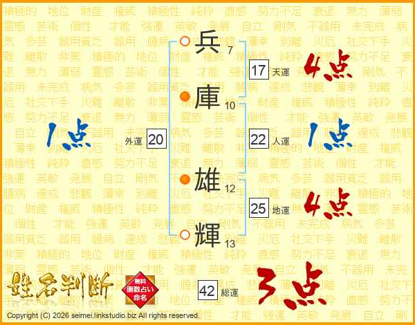 兵(7画)庫(10画) 雄(12画)輝(13画)