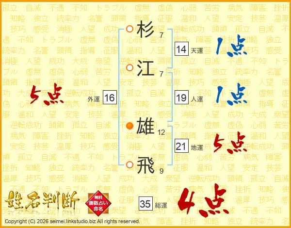 杉(7画)江(7画) 雄(12画)飛(9画)