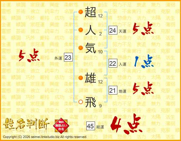 超人気雄飛さんの天運は24画の5点!