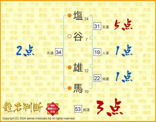 塩(24画)谷(7画) 雄(12画)馬(10画)