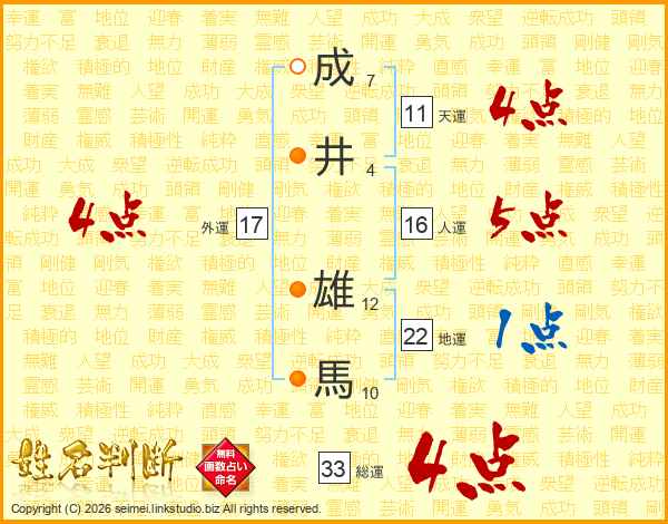 生活面を象徴する運勢です。外部から受ける影響力を表し、結婚運、家庭運や職場、環境への順応性を表します。総運から人運を引いた画数。姓や名が1文字の場合を除く。