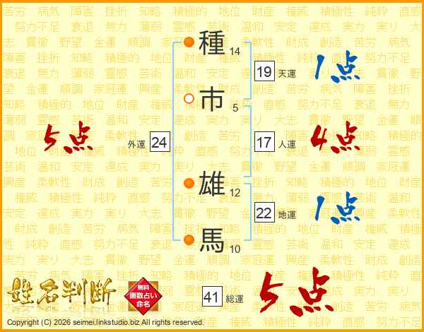 生活面を象徴する運勢です。外部から受ける影響力を表し、結婚運、家庭運や職場、環境への順応性を表します。総運から人運を引いた画数。姓や名が1文字の場合を除く。